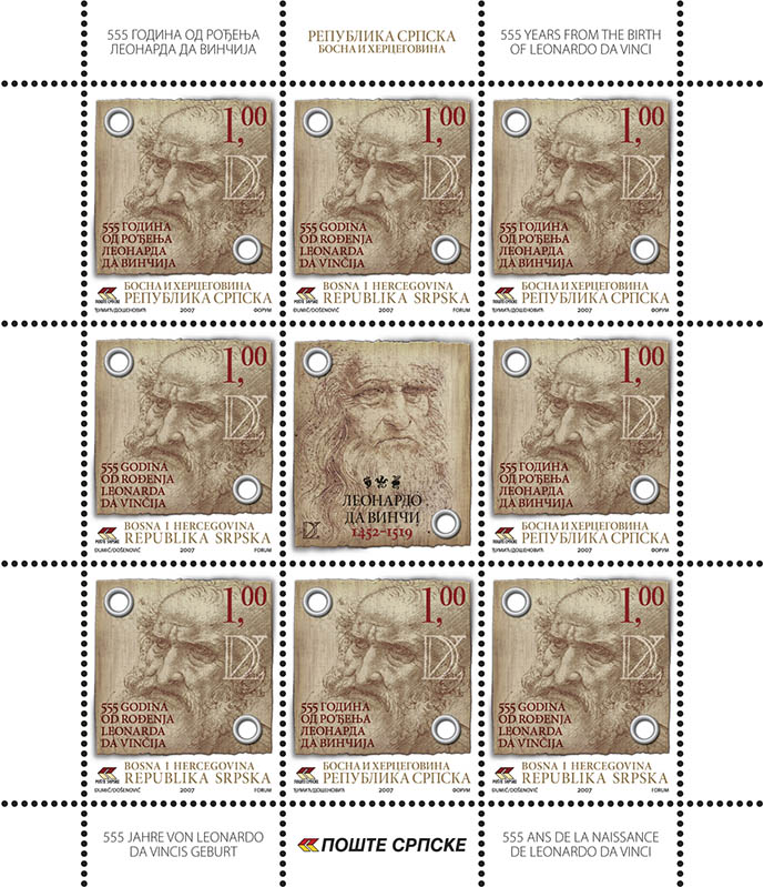 Naziv izdanja: 555 god. od rođenja Leonarda da Vinčija Datum izdanja: 16.04.2007. Autor: Đumić/Došenović Vrsta izdanja: prigodno Tehnika štampanja: višebojni ofset Šalterski tabak: 8+1 (3x3) Papir: muflep,100g Štamparija: FORUM - Novi Sad