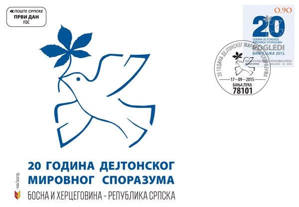 Naziv izdanja: 20 godina od Dejtonskog mirovnog sporazuma Datum izdanja: 17.09.2015. Autor: Milana Đurić Vrsta izdanja: prigodno Tehnika štampanja: višebojni ofset Šalterski tabak: 8+1 Papir: muflep 100g Štamparija: Forum, Novi Sad
