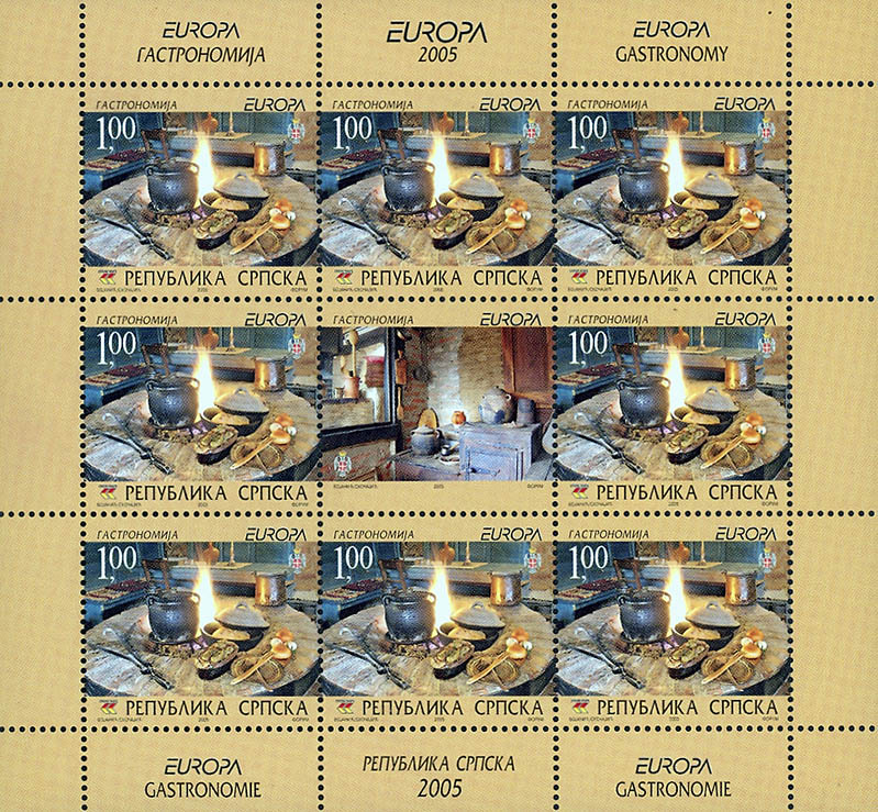 Naziv izdanja: Europa 2005 - Gastronomija Datum izdanja: 04.04.2005 Autor: Bojanić/Skočajić Vrsta izdanja: prigodno Tehnika štampanja: višebojni ofset Šalterski tabak: 8+1 komad (3x3) i karnet sa 3 serije Papir: tullis russell, 100 gr Štamparija: FORUM - Novi Sad