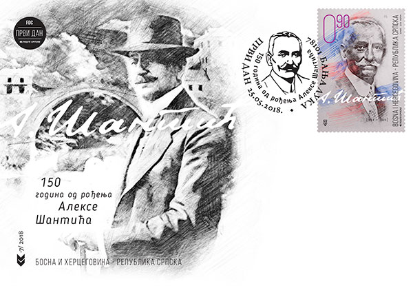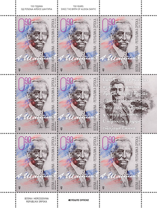 Aleksa Šantić (1868 - 1924) je bio srpski pjesnik i akademik, rodom iz Mostara gde je proveo većinu života i pjesničkog stvaralaštva. Pošto je živio u trgovačkoj porodici, ukućani nisu imali dovoljno razumijevanja za njegov talenat. Završio je trgovačku školu u Trstu i Ljubljani, potom se vratio u Mostar. Bio je „prvo vrijeme prilično povučen“, vodio knjige u očevoj trgovini i čitao „listove i knjige do kojih je mogao u Mostaru doći“. Nekoliko godina kasnije započeo je svoj književni i društveni rad. Najveća djela stvarao je krajem 19. i početkom 20. vijeka. Uzori su mu bili srpski pisci Vojislav Ilić i Jovan Jovanović Zmaj, a od stranih je najviše poštovao Hajnriha Hajnea. U njegovim pjesmama ima emocionalnog bola, rodoljublja, ljubavne čežnje i prkosa za nacionalno i socijalno ugrožen srpski narod. 1902. otišao je u Ženevu, ali je tamo jedva „izdržao tri nedelje; u naivnoj pjesmi „Ja ne mogu ovdje“ on je prostosrdačno zavapio kako ne može da podnese tuđinu“. Za vrijeme aneksione krize bio je, sa Svetozarom Ćorovićem i Nikolom Кašikovićem, prebjegao u Italiju i stavio se na raspoloženje srpskoj vladi, kao što će to ponoviti i 1912. godine, na početku Balkanskog rata“. Godine 1913. g austrougarske vlasti su ga protjerale iz Mostara. U toku Prvog svjetskog rata zatvoren je kao talac i „u dva puta ponavljanoj parnici“ optuživan zbog svojih pjesama. Po završetku rata izabran je u Mostaru za člana Srpskog odbora. Za vrijeme njegovog života književna kritika je istakla dva „osnovna i jaka“ osjećanja u njegovoj poeziji. Prvo osjećanje je „žarka ljubav prema svome narodu“. Od početka to osjećanje javlja se, uglavnom, u tri vida: kao ponos junačkom prošloću, kao protest protiv mučne sadašnjosti i kao vjera u bolju budućnost do koje će se doći kroz borbu i pobjedu koja će predstavljati vaskrsnulu prošlost. Autor: Nebojša Đumić Izdavač: Pošte Srpske a.d. Banja Luka