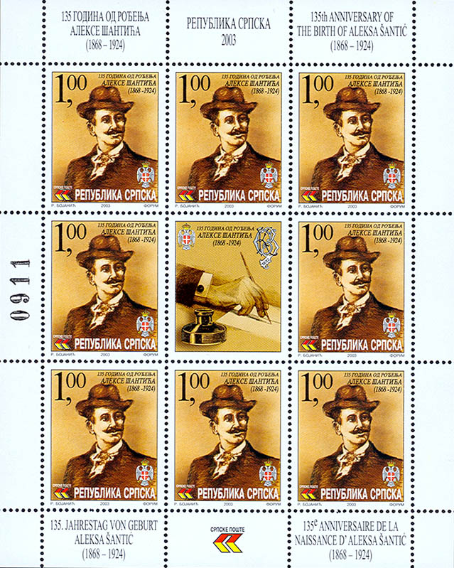 Naziv izdanja: 135 godina od rođenja Alekse Šantića Datum izdanja: 05.03.2003 Autor: Radomir Bojanić Vrsta izdanja: prigodno Tehnika štampanja: višebojni ofset Šalterski tabak: 8+1(3x3) Papir: kredast Štamparija: FORUM-Novi Sad