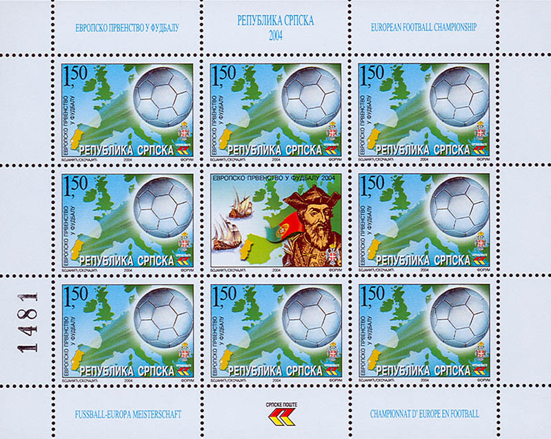 Motiv: Karta Evrope sa izdvojenim konturama Portugalije i fudbalska lopta Kataloški broj: SP 303 Zupčanje: 13 3/4 Nominalna vrijednost: 1,50 KM Tiraž: 18.000