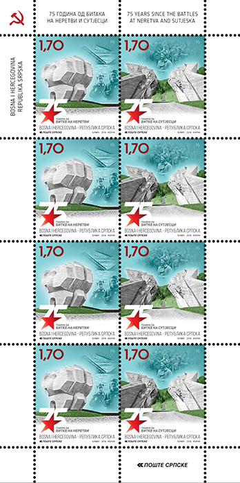 Naziv izdanja: 75 godina od bitaka na Sutjesci i Neretvi Datum izdanja: 05.11.2018. Autor: Nebojša Đumić Vrsta izdanja: prigodno Tehnika štampanja: višebojni ofset Šalterski tabak: 4x2 Papir: muflep 100g Štamparija: Forum, Novi Sad