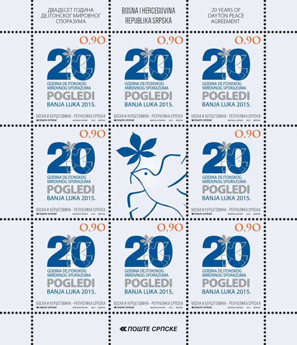 Naziv izdanja: 20 godina od Dejtonskog mirovnog sporazuma Datum izdanja: 17.09.2015. Autor: Milana Đurić Vrsta izdanja: prigodno Tehnika štampanja: višebojni ofset Šalterski tabak: 8+1 Papir: muflep 100g Štamparija: Forum, Novi Sad