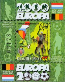 Naziv izdanja: Evropsko prvenstvo u fudbalu 2000 Datum izdanja: 14.06.2000 Autor: Radomir Bojanić Vrsta izdanja: prigodno Tehnika štampanja: višebojni ofset Šalterski tabak: 8+1 (3x3) Papir: kredast Štamparija: FORUM - Novi Sad