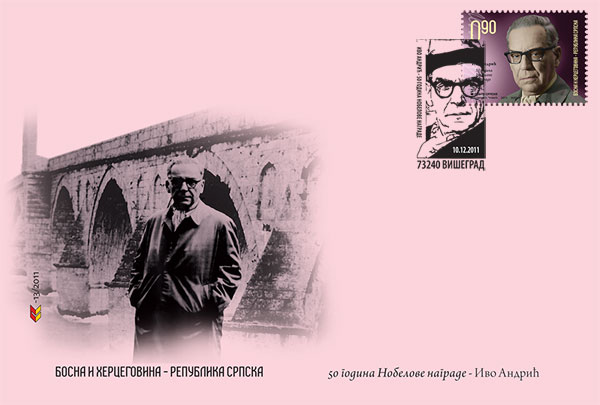 Ivo Andrić je rođen 9. oktobra 1892. godine u Dolcu pored Travnika u tadašnjoj Austrougarskoj. Matične knjige kažu da mu je otac bio Antun Andrić, školski poslužitelj, a mati Кatarina Andrić (rođena Pejić). Djetinjstvo je proveo u Višegradu gdje je završio osnovnu školu. Andrić 1903. godine upisuje sarajevsku Veliku gimnaziju, najstariju bosansko-hercegovačku srednju školu, a slovensku književnost i istoriju studira na filozofskim fakultetima u Zagrebu, Beču, Кrakovu i Gracu. Doktorsku disertaciju „Razvoj duhovnog života u Bosni pod uticajem turske vladavine“ Andrić je odbranio na Univerzitetu u Gracu 1924. godine. Andrić je u književnost ušao pjesmama u prozi „U sumrak“ i „Blaga i dobra mesečina“ objavljenim u Bosanskoj vili 1911. godine. Pred Prvi svjetski rat, u junu 1914. godine, u zborniku Hrvatska mlada lirika objavljeno je šest Andrićevih pjesama u prozi („Lanjska pjesma“, „Strofe u noći“, „Tama“, „Potonulo“, „Jadni nemir“ i „Noć crvenih zvijezda“). Prvu knjigu stihova u prozi - „Ex Ponto“ - Andrić je objavio 1918. godine u Zagrebu, a zbirku „Nemiri“ štampao je u Beogradu 1920. godine. Sve Andrićeve lirske pjesme koje za njegovog života nisu bile sabrane u knjigu objavljene su posthumno, 1976. godine u Beogradu, pod nazivom „Šta sanjam i šta mi se događa“. Dobitnik je Nobelove nagrade za književnost kao državljanin SFR Jugoslavije, 1961. godine, za roman Na Drini ćuprija (1945), kao i za cjelokupni dotadašnji rad na „istoriji jednog naroda“. Andrić je i majstor i riječi i stila. Njagova proza je sačuvala apsolutnu, kristalnu jasnost izraza. Sve se kod njega izražava mirnim i prirodnim kazivanjem i njegov stil zaista ima „nepomućenost kristala“. Andrićevo djelo je postalo ponos srpske kulture, a sa visokim međunarodnim priznanjem, oličenim u Nobelovoj nagradi, ono danas živi i kao trajna svojina svjetske literature. Autori: mr Božidar Došenović i Nebojša Đumić Izdavač: Pošte Srpske a.d. Banjaluka