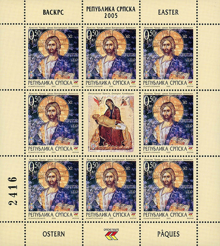 Naziv izdanja: Vaskrs Datum izdanja: 18.04.2005 Autor: Bojanić/Skočajić Vrsta izdanja: prigodno Tehnika štampanja: višebojni ofset Šalterski tabak: 8+1 komad (3x3) Papir: tullis russell, 100 gr Štamparija: FORUM - Novi Sad