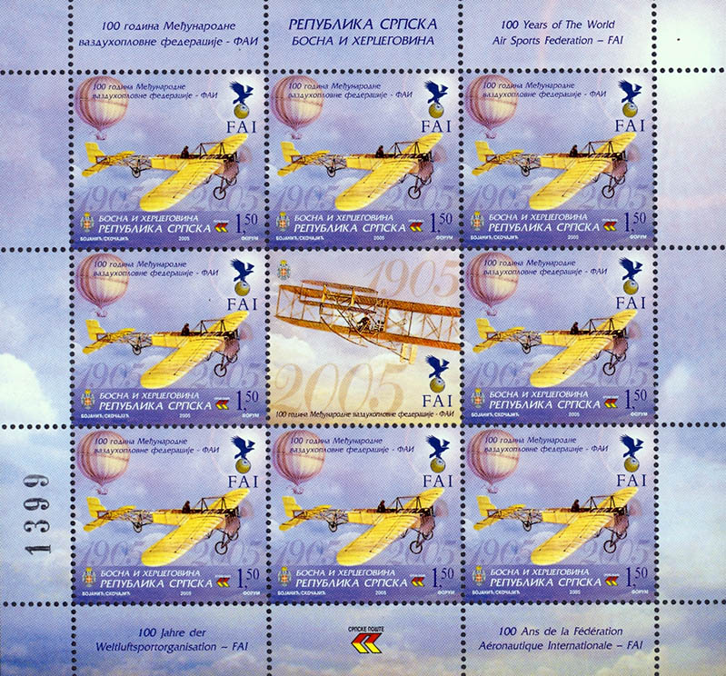 Naziv izdanja: 100 godina Međunarodne vazduhoplovne federacije - FAI Datum izdanja: 14.10.2005 Autor: Bojanić/Skočajić Vrsta izdanja: prigodno Tehnika štampanja: višebojni ofset Šalterski tabak: 8+1 komad (3x3) Papir: tullis russell, 100 gr Štamparija: FORUM - Novi Sad