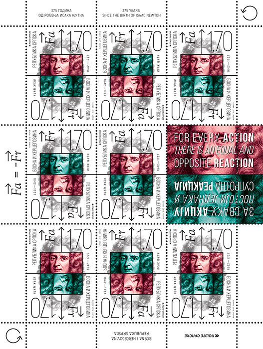 Isak Njutn je bio engleski fizičar, matematičar, astronom, alhemičar i filozof prirode, koji je danas za većinu ljudi jedna od najvećih ličnosti u istoriji nauke. Rođen je 4. januara 1643. u Linkolnširu, a preminuo je 31. marta 1727. u Londonu. Njagova studija Matematički principi prirodne filozofije, objavljena 1687, koja opisuje univerzalnu gravitaciju i tri zakona kretanja, postavila je temelje klasične (Njutnove) mehanike i poslužila kao primjer za nastanak i razvoj drugih modernih fizičkih teorija. Izvodeći iz ovog svog sistema Кeplerove zakone kretanja planeta, on je bio prvi koji je pokazao da se kretanja tijela na Zemlji i kretanja nebeskih tijela potčinjavaju istim fizičkim zakonima. Ujedinjujuća i deterministička moć njegovih zakona dovela je do revolucije u nauci i do daljeg napretka i uzdizanja heliocentrizma. U mehanici, Njutn je takođe ukazao na jedan novi, veliki, značaj principa održanja impulsa i momenta impulsa. U optici, on je napravio prvi praktični refleksioni (ogledalski) teleskop i otkrio da se propuštanjem bijele svetlosti kroz staklenu prizmu ona razlaže u spektar svih boja. Njutn se snažno zalagao u prilog čestične prirode svjetlosti. On je takođe formulisao empirijski zakon hlađenja, proučavao brzinu zvuka i predložio teoriju o poreklu zvijezda. U matematici, Njutn dijeli zasluge sa Gotfridom Lajbnicom za otkriće infinitezimalnog računa. On je takođe izložio i uopštenu binomsku teoremu, razvijajući na taj način tzv. „Njutnov metod“ za aproksimacije nula funkcije i doprinoseći proučavanjima razlaganja funkcija u redove. Engleski pjesnik Aleksandar Poup, dirnut Njutnovim postignućima, napisao je čuveni epitaf: Priroda i prirodni zakoni u noćnoj tami nalaze skrivenost; Bog reče “Neka bude Njutn” i sve postade svjetlost. Autor: Nebojša Đumić Izdavač: Pošte Srpske a.d. Banja Luka