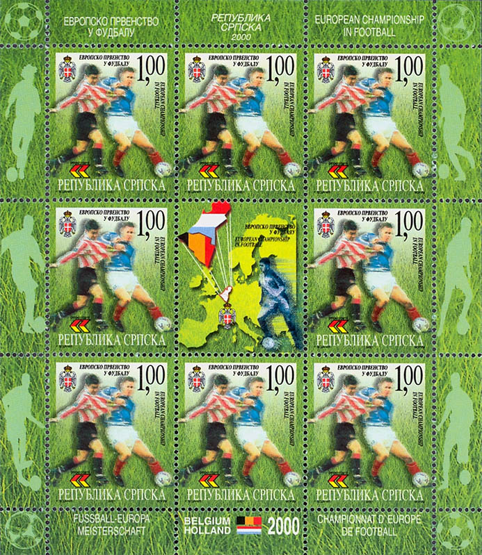 Naziv izdanja: Evropsko prvenstvo u fudbalu 2000 Datum izdanja: 14.06.2000 Autor: Radomir Bojanić Vrsta izdanja: prigodno Tehnika štampanja: višebojni ofset Šalterski tabak: 8+1 (3x3) Papir: kredast Štamparija: FORUM - Novi Sad