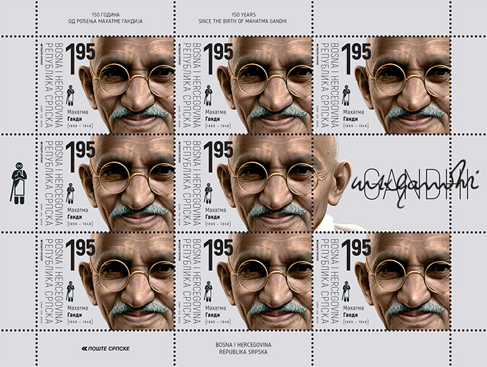 Naziv izdanja: 150 godina od rođenja Mahatme Gandi Datum izdanja: 02.10.2019. Autor: Nebojša Đumić Vrsta izdanja: prigodno Tehnika štampanja: višebojni ofset Šalterski tabak: 8+1 Papir: muflep 100g Štamparija: Forum, Novi Sad