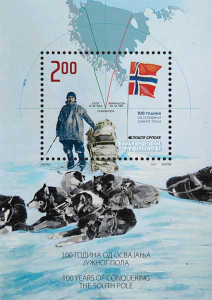 Naziv izdanja: 100 godina od osvajanja Južnog pola Datum izdanja: 14.12.2011. Autor: Nikola Zaklan Vrsta izdanja: prigodno Tehnika štampanja: višebojni ofset Šalterski tabak: 8+1, blok Papir: muflep 100g Štamparija: Forum, Novi Sad