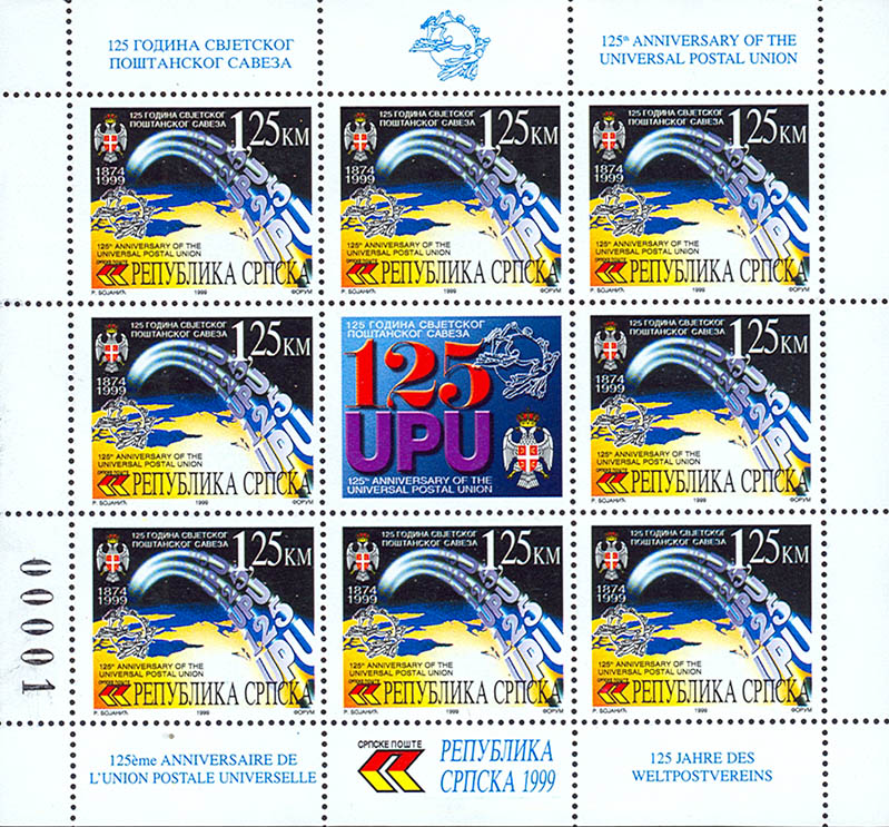 Motiv: Natpis "125 UPU" kruži oko Zemlje i amblem UPU sa lijeve strane Kataloški broj: SP 142 Zupčanje: 13 3/4 Nominalna vrijednost: 1,25 KM Tiraž: 10.000