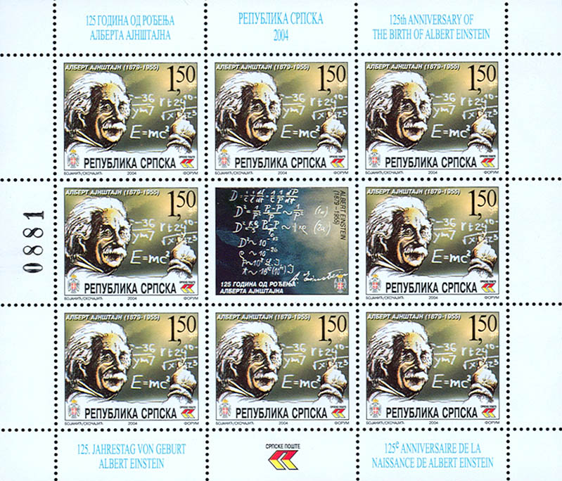 Motiv: Portret Alberta Ajnštajna (1879-1955) Kataloški broj: SP 296 Zupčanje: 13 3/4 Nominalna vrijednost: 1,50 KM Tiraž: 15.000