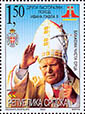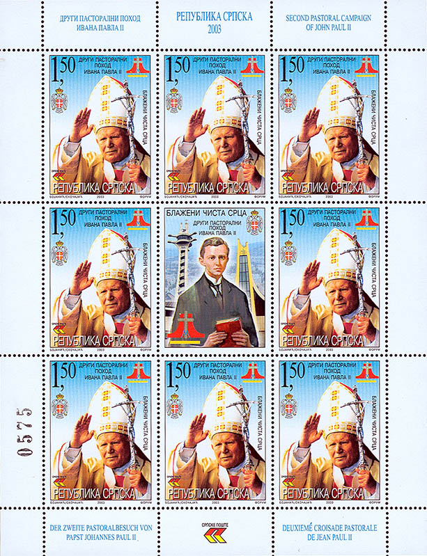 Naziv izdanja: Drugi pastoralni pohod Ivana Pavla II Datum izdanja: 22.06.2003 Autor: Bojanić/Skočajić Vrsta izdanja: prigodno Tehnika štampanja: višebojni ofset Šalterski tabak: 8+1 (3x3) Papir: kredast Štamparija: FORUM-Novi Sad