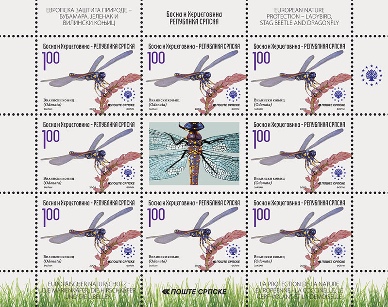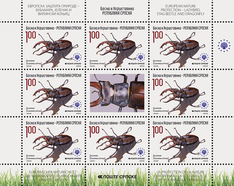 Naziv izdanja: Evropska zaštita prirode - bubamara, jelenak i vilinski konjic Datum izdanja: 09.09.2009. Autori: Zaklan/Đumić/Došenović Vrsta izdanja: prigodno Tehnika štampanja: višebojni ofset Šalterski tabak: 8+1 (3x3) Papir: muflep 100g Štamparija: Forum, Novi Sad