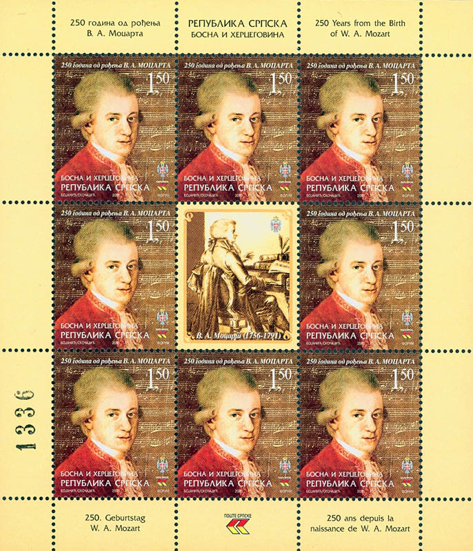 Naziv izdanja: 250 godina od rođenja Volfganga Amadeusa Mocarta Datum izdanja: 27.01.2006 Autor: Bojanić/Skočajić Vrsta izdanja: prigodno Tehnika štampanja: višebojni ofset Šalterski tabak: 8+1 (3x3) Papir: tullis rusell, 100 gr Štamparija: Forum Novi Sad