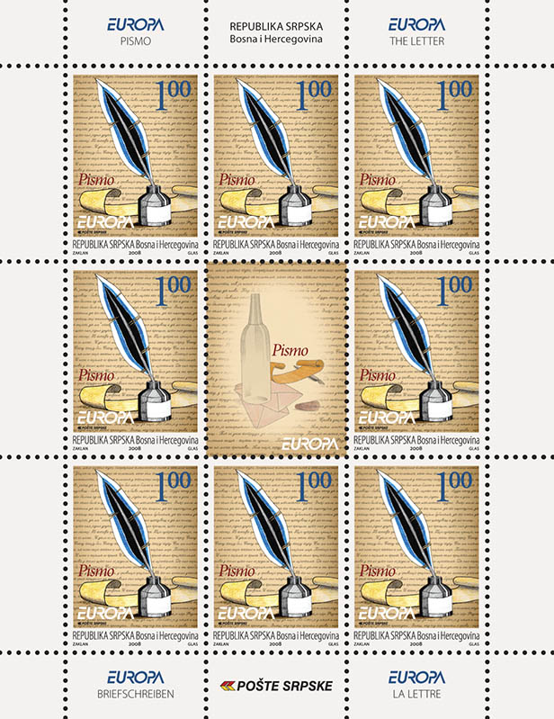 Motiv: ruka i pero Kataloški broj: 422 (karnet) Zupčanje: 13 3/4 Nominalna vrijednost: 9,00 KM Tiraž: 25 000