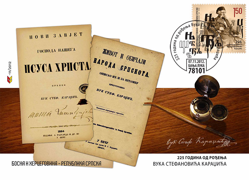 Naziv izdanja: 225 godina od rođenja Vuka Stefanovića Karadžića Datum izdanja: 07.11.2012. Autori: mr Božidar Došenović i Nebojša Đumić Vrsta izdanja: prigodno Tehnika štampanja: višebojni ofset Šalterski tabak: 8+1 Papir: muflep 100g Štamparija: Forum, Novi Sad