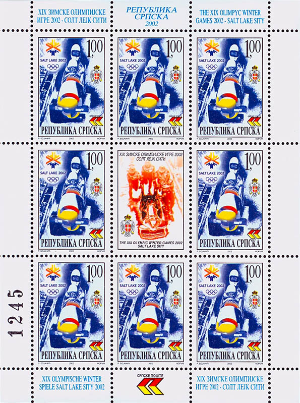 Naziv izdanja: Zimske olimpijske igre 2002 Datum izdanja: 13.02.2002 godine Autor: Radomir Bojanić Vrsta izdanja: prigodno Tehnika štampanja: višebojni ofset Šalterski tabak: 8+1 komad (3x3) Papir: kredast Štamparija: FORUM - Novi Sad