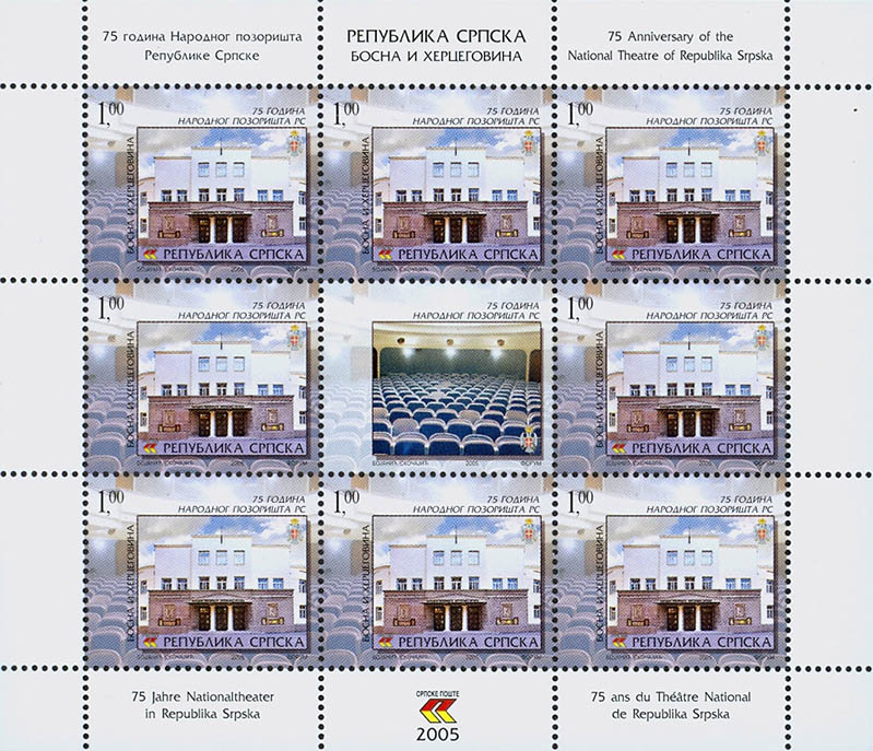 Motiv: Zgrada Narodnog pozorišta RS, u pozadini današnji izgled velike sale Kataloški broj: SP 349 Zupčanje: 13 3/4 Nominalna vrijednost: 1,00 KM Tiraž: 12 000