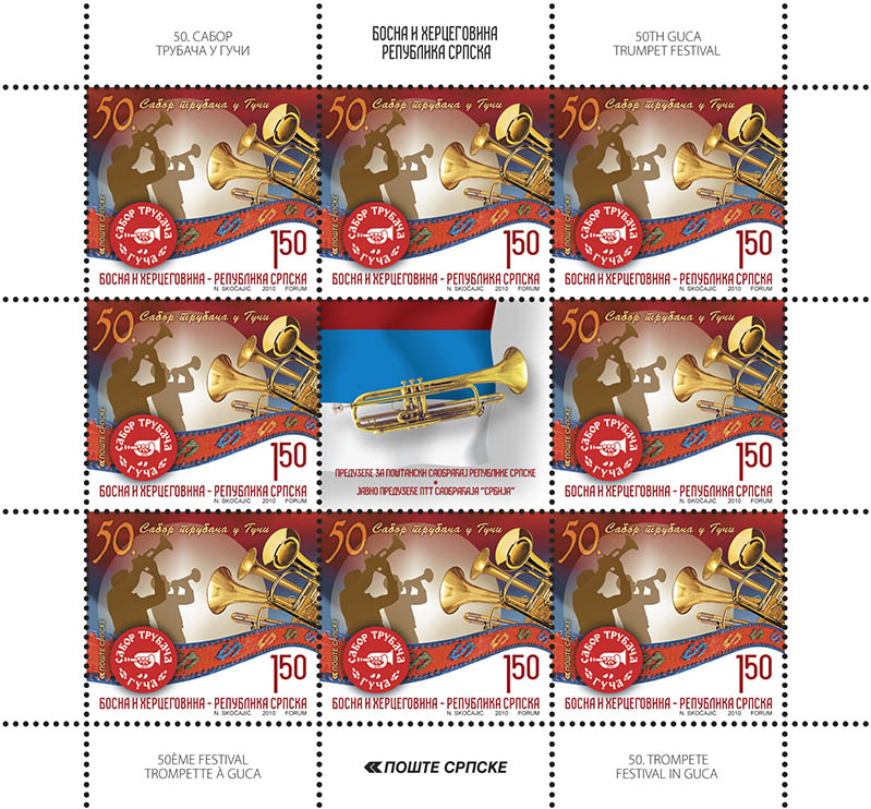 Naziv izdanja: 50. Sabor trubača u Guči Datum izdanja: 13.08.2010. Autor: Nadežda Skočajić Vrsta izdanja: prigodno Tehnika štampanja: visebojni ofset Šalterski tabak: 8+1 (3x3) Papir: muflep, 100g Štamparija: Forum, Novi Sad