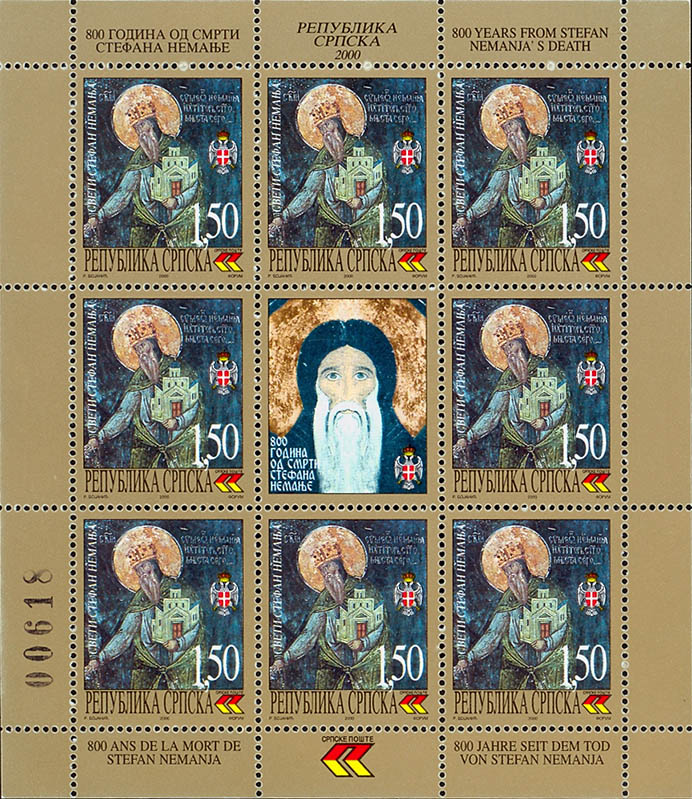 Naziv izdanja: 800 godina od smrti Stefana Nemanje Datum izdanja: 29.02.2000 godine Autor: Radomir Bojanić Vrsta izdanja: prigodno Tehnika štampanja: višebojni ofset Šalterski tabak: 8+1 komad (3x3) Papir: kredast Štamparija: FORUM - Novi Sad