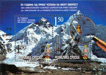 Motiv: Najviši vrh Himalaja Mont Everest i planinar pod lupom Kataloški broj: SP 269, 270 (BL 009) Zupčanje: 13 3/4 Nominalna vrijednost: 3,00 KM Tiraž: 14.000