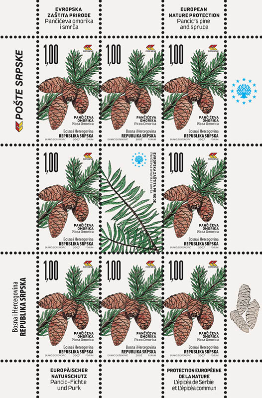Naziv izdanja: Evropska zaštita prirode Pančićeva omorika i Smrča Datum izdanja: 09.11.2007. Autor: Zaklan/Đumić/Došenović Vrsta izdanja: prigodno Tehnika štampanja: višebojni ofset Šalterski tabak: 8+1 (3x3) Papir: muflep,100g Štamparija: FORUM - Novi Sad