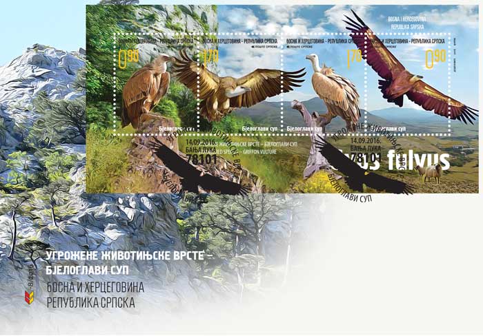 Među pticama, najugroženija grupa su ptice grabljivice. Sve četiri vrste orlova lešinara smo izgubili u Republici Srpskoj. Popovo polje i planina Bjelasnica jedno je od posljednjih staništa i mjesta gniježđenja bjeloglavog supa u istočnoj Hercegovini. Na tom području posljednje jato viđeno je krajem 20. vijeka. Prema dostupnim podacima, posljednja kolonija bjeloglavog supa u Popovom polju iščezla je sa početkom ratnih dešavanja 1991. godine. Dio tog jata naselio se na Uvac, što je povećalo brojnost populacije u Srbiji. Bjeloglavi sup je velika i uočljiva ptica grabljivica koja teži do 8,5 kg, dok raspon krila može da dostigne 2,8 m i prilagođena su jedrenju na vazdušnim strujama. Bjeloglavi sup se gnijezdi na stijenama, obrazujući manje ili veće grupe gnijezda (kolonije). Ženka nosi samo jedno jaje. Životni vijek u prirodi im je oko 20 godina. Za razliku od ostalih vrsta lešinara, hrani se isključivo uginulim životinjama, najčešće mekim tkivom uginulih preživara i na taj način obavlja sanitarnu ulogu u prirodi, sprečavajući širenje raznih bolesti. Nalazi se u Dodatku II CITES liste i predstavlja vrstu u nestajanju. EU Direktiva o pticama (Council of Europe, 1979 b) svrstava ga u Dodatak I ugroženih vrsta ptica u Evropi. Svojim specifičnim letom plijeni pažnju posmatrača i budi inspiracije generacijama. Legendarna ptica je imala snažan uticaj u razvoju ljudskog društva i dio je kulture drevnih naroda i carstava tokom istorije civilizacije. Bjeloglavi sup je mitska ptica, dio je kolektivnog pamćenja srednjevjekovne Srbije i nalazimo ga na grbovima dinastija Mrnjavčevića, Nemanjića, Lazarevića i Crnojevića. Ova izuzetna vrsta skreće pažnju javnosti na potrebu očuvanja biodiverziteta i često se pominje kao atribut lokalnih zajednica za očuvanje prirode i razvoj turizma. Autor: mr Božidar Došenović Izdavač: Pošte Srpske a.d. Banjaluka Stručna saradnja: Dejan Radošević, diplomirani ekolog, Zavod za zaštitu kulturno-istorijskog i prirodnog nasljeđa Republike Srpske