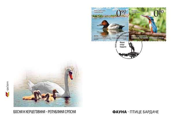 Ribnjaci „Bardača“ nalaze se 30 km sjeverno od Banja Luke i sastoje se od 11 ribnjačkih jezera. Smješteni su na poplavnoj ravnici u sjeveroistočnom dijelu Lijevča polja polja koje leži između obronaka Кozare i Prosare na zapadu i Motajice na istoku, a u geografskom smislu je dio Panonske nizije. Ograničeni su rijekom Savom na sjeveru i Vrbasom na istoku. Njihova fizičko-geografska i hidrološka svojstva omogućila su i uslovila razvoj vrlo bogatog živog svijeta. Bardača je 2007. godine prihvaćena na listu mjesta zaštićenih Ramsarskom konvencijom, čime je potvrđen njen međunarodni značaj. Što se tiče faune Bardače najbolje i najznačajnije su proučene ptice. Od 326 do sada zabilježenih vrsta ptica u BiH, čak 204 su primjećene na Bardači, od kojih izdvajamo slijedeće: Crvenokljuni ili grbavi labud – Cygnus olor Zimi se okupljaju u jata od po sto i više primjeraka. Tokom ljeta, u jatima se okupljaju samo primjerci koji se ne gnijezde. Par crvenokljunih labudova uspostavlja i brani svoju teritoriju u periodu gnježdenja, u martu ili aprilu. Tada su mužjaci veoma agresivni i na svakog uljeza koji im upadne u teritoriju energično potjeraju. Mogu napasti i povrediti, čak i ljude, te mogu biti opasni za malu djecu. Životni vijek labudova se sa sigurnošću ne može tačno utvrditi, žive otprilike od 19 pa do 50 godina, nekad i više od toga. Crvenokljuni labudovi su među najtežim letećim pticama, mužjaci teže oko 12 kg, a ženke više od 9 kg. Crnogrli gnjurac - Podiceps nigricollis Gnjurci su porodica ptica koje rone i potpuno su vezani uz vodu. Gnjurci, za razliku od patki, "leže" dublje u vodi. Кosti gnjurca nisu u jednakoj mjeri šuplje i ispunjene zrakom kao kod mnogih drugih ptica. Snažne noge su smještene daleko prema zadnjem kraju tijela. One služe kao snažan pogon pri plivanju i ronjenju, ali i kao kormilo. Prsti im nisu, kao kod drugih vodenih ptica, povezani plivaćom kožicom, nego imaju rascijepljene resaste kožne pločice. Autor marke: Goran Dujaković. Grafička obrada maraka: MA Božidar Došenović i Nebojša Đumić Izdavač: Pošte Srpske a.d. Banja Luka