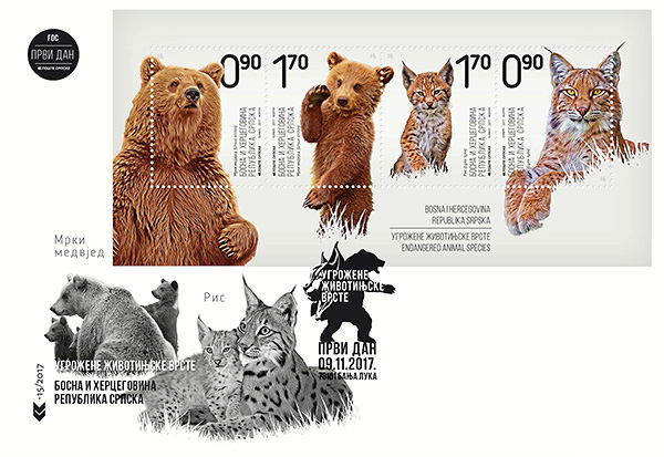 Biodiverzitet na Zemlji danas čine milioni različitih bioloških vrsta, koje su proizvod 4 milijarde godina evolucije. Iako je izumiranje životinja dio prirodnog ciklusa, prisustvo i dominacija ljudi na Zemlji ubrzala je stopu po kojoj vrste nestaju. Broj ugroženih vrsta širom svijeta raste. Prema podacima Međunarodne unije za zaštitu prirode (IUCN) Bosna i Hercegovina ima 55 ugroženih vrsta.Vlada Republike Srpske je 2012. godine donijela Uredbu o Crvenoj listi zaštićenih vrsta flore i faune. Jedna od vrsta koja se nalazi na Crvenoj listi i spada u ugrožene vrste u našoj zemlji je ris. Ris (Lynx lynx) je zvijer iz porodice mačaka koji je prepoznatljiv po dlakavim kićankama crne boje, koji se nalaze na vrhovima ušiju. Glavni plijen su mu srne, divokoze i puhovi, a glavni prirodni neprijatelji vuk i medvjed. Osim prirodnih neprijatelja najveća opasnost za risa je čovjek koji se bavi krivolovom i lovi ga zbog krzna i trofeja. Ris je proglašen trajno zaštićenom vrstom u Bosni i Hercegovini jer je početkom 20. vijeka već jednom bio istrebljen. U Bosni i Hercegovini ris se ponovo pojavio nakon reintrodukcije u Sloveniji i prema trenutnim podacima brojnost populacije iznosi oko 60 jedinki. Mrki medvjed (Ursus artcos) spada u najveću divlju životinju u BiH. Dužina njegovog tijela može biti do 2,8 m, a masa do 300 kg. Uglavnom je biljojed ali meso jede kad god mu je dostupno.U toku zime zbog nestašice hrane prelazi u stanje mirovanja i vrijeme provodi u brlogu. Zbog promjene uslova u njihovim prirodnim staništima, medvjedi se spuštaju u niže dijelove u potrazi za hranom i privučeni deponijama dolaze do ljudskih naselja i pričinjavaju štete što dovodi do straha među stanovništvom. Da bismo ovo spriječili treba da obezbjedimo hranilišta za medvjede u njihovim staništima, koja će ih tu i zadržati. Broj medvjeda u Republici Srpskoj iznosi oko 700 jedinki. Autor: Nebojša Đumić Saradnja: Tatjana Borenović Izdavač: Pošte Srpske, a.d. Banjaluka