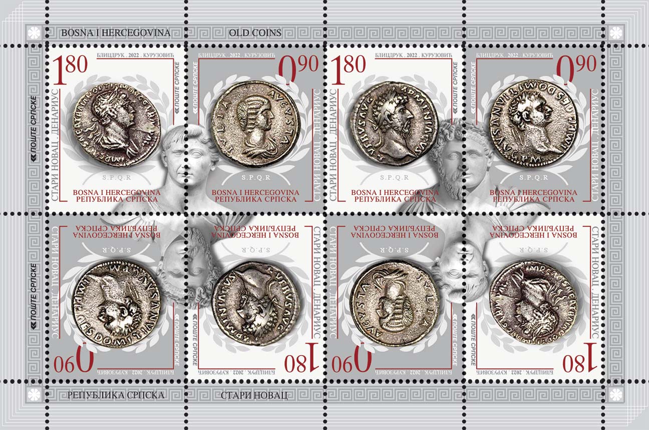 Izdavanje novca u Rimu je, uglavnom, bilo rerzervisano za imperatore i njihove porodice, mada su ga mogli izdati i drugi, koji su to sebi mogli priuštiti. Rimska imperija se prostirala od Atlantskog okeana na zapadu, pa do Mrtvog Mora na istoku i Sahare na jugu, do Dunava na sjeveru, a samim tim i na ovom prostoru. Način pronalaska rimskog (i ostale vrste) novca možemo podijeliti u tri vrste: nalaz prilikom arheološkog istraživanja terena, slučajni ostavski (grupni) nalaz i pojedinačni slučajni nalazi. Svi ovi novčići, predstavljeni poštanskim markama, su nađeni kao slučajni pojedinačni nalazi uz korito rijeke Save u Gradišci. Sava je bila jedna od važnijih saobraćajnica za transport robe, a Gradiška je imala i luku u to doba uz naselje Servicijum (na mjestu današnjeg grada Gradiške), koje je bilo važna raskrsnica puteva. Sve to nam daje predispoziciju za bogate i raznovrsne arheološke nalaze iz tog perioda. Ovim izdanjem predstavili smo četiri novčića u njihovoj stvarnoj veličini, prečnika 19 mm i to: Novčić sa jednim od najvećih rimskih vladara: Trajan – Marcus Ulpius Nerva Traianus. Vladao je od 98. do 117. godine. Bio je rimski car, nasljednik Nervin i pripadnik Antoninske dinastije. Novčić sa likom Julie Avguste (193-217) žene imperatora Septimija Severa, majka imperatora Кarakale iz dinastije Sever. Novčić sa rimskim imperatorom - Lucius Verus (161-169). Pripadao je dinastiji Antonina. Usvojeni sin Antoniusa Piusa, kojeg je naslijedio na tronu. Naslijedio ga je sin Antoniusa Pisa, Marko Aurelije. Novčić sa likom Domicijana (Titus Flavius Domitianus) koji je vladao od 81. do 96. godine. Bio je Vespazijanov sin i Titusov mlađi brat, kao i posljednji car u dinastiji Flavijevaca. Autor: Tanja Кuruzović Izdavač: Pošte Srpske a.d. Banjaluka Saradnja: Udruženje kolekcionara i ljubitelja istorije ‘’Denarius’’, Gradiška; Mešić Alen, Miroslav Кecman, Albin Zidar