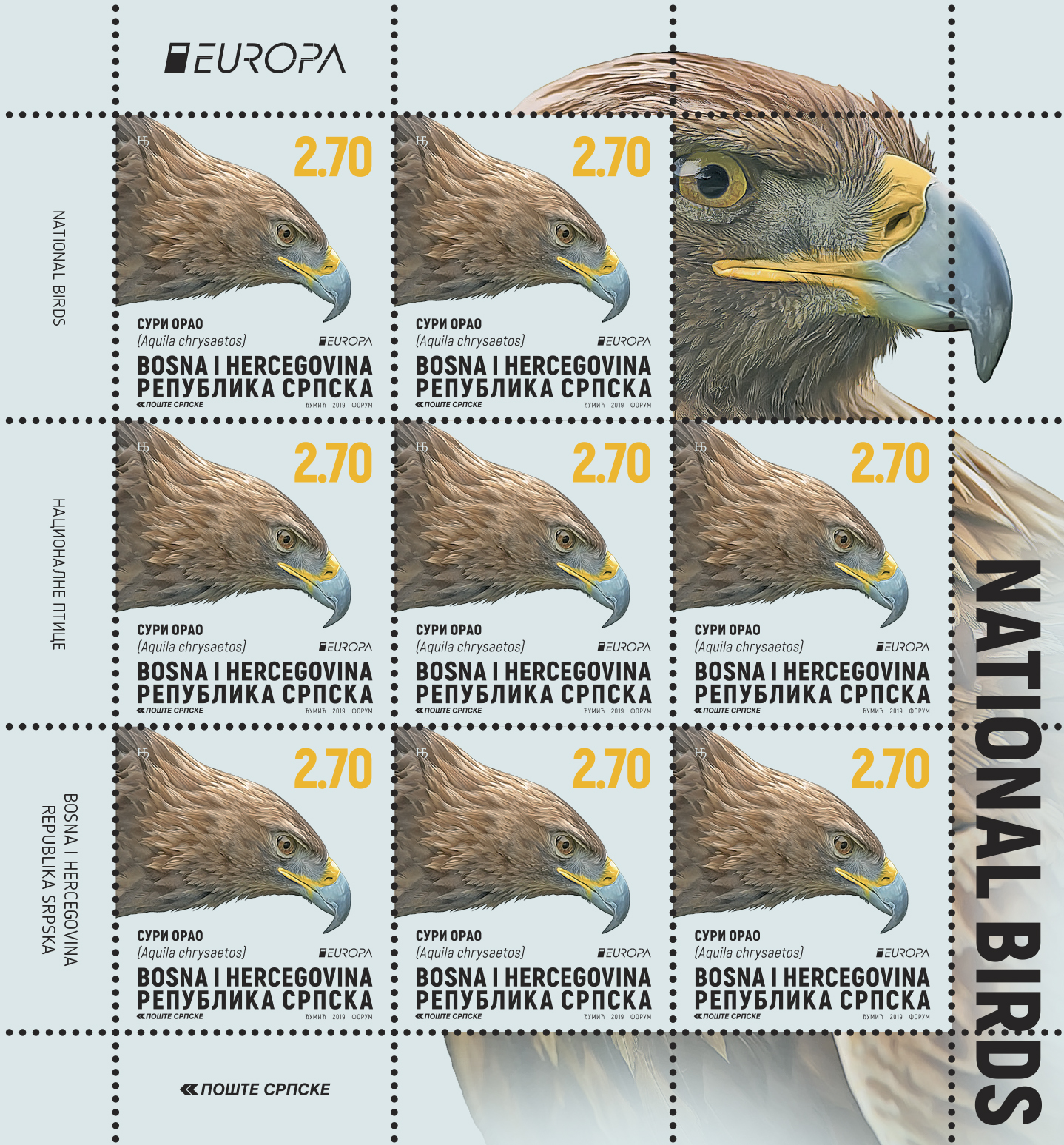 Naziv izdanja: Evropa - nacionalne ptice Datum izdanja: 24.04.2019. Autor: Nebojša Đumić Vrsta izdanja: prigodno Tehnika štampanja: višebojni ofset Šalterski tabak: 8+1 i karnet Papir: muflep 100g Štamparija: Forum, Novi Sad