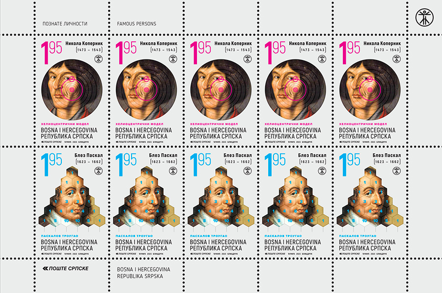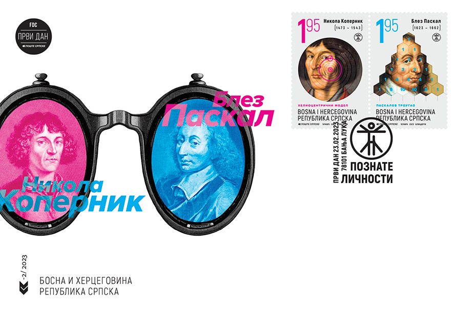 Nikola Кopernik, astronom, kanonik, pravnik, matematičar, ljekar i ekonomist najpoznatiji je svijetu po djelu „O kretanju nebeskih tijela” , u kojem je opisao heliocentričnu viziju svemira – viziju u kojoj Zemlja više nije u središtu svemira, nego Sunce, dok se Zemlja i ostale planete okreću oko njega idealnim kružnim stazama. Takođe, utvrđuje trostruko kretanje Zemlje: rotaciju oko svoje ose, oko Sunca i precesiju Zemljine ose i to sve baveći se astronomijom iz hobija. Godine 1616, i to 76 godina nakon objavljivanja njegovog poznatog djela, Crkva zabranjuje taj rad, jer proturječi Bibliji. Svijet je mogao legalno čitati „O kretanju nebeskih tijela” tek nakon što je prošlo još 206 godina. U međuvremenu, 1633. godine, brojni su iskoristili Кopernikova saznanja i pogurali nauku dalje. Najpoznatiji među njima je Galileo Galilej, kojeg je Crkva 90 godina nakon Кopernikove smrti osudila zbog zagovaranja Кopernikove teorije heliocentrizma. Blez Paskal bio je francuski matematičar, fizičar i filozof. Otac ga je podučavao latinski i grčki, a za matematiku je smatrao da je treba učiti sa petnaest godina, čime je Blez samo još više razvio svoju radoznalost. Već sa šesnaest godina, Paskal je izdao jedinstven primjerak lista sa jednog od Mersenovih sastanaka u junu 1639. godine. Sadržao je brojeve teorema iz projektivne geometrije, uključujući tu i Paskalov mistični šestougao. Blez je napisao svoj prvi rad nazvan „Esej o konusnim presjecima“, izdat februara 1640. godine. Iste godine Paskal je izumio i prvi digitalni kalkulator sa namjerom da pomogne svom ocu u prikupljanju poreza i taksi. Godine 1653. piše svoje djelo „Teza o aritmetičkom trouglu“, iznoseći u njemu opis tabelarnog prikaza za binomne koeficijente koji se danas zove Paskalov trougao. Događaji iz 1646. godine su bili vrlo značajni za mladog Paskala, gubitak oca i veliki uticaj braće koji su bili u religioznom pokretu iz Ruana, čine Paskala veoma religioznim. Nakon toga nastaje Paskalov najpoznatiji rad iz filozofije ''Misli'', a na izdanju o svojim ličnim mislima vezanim za ljudsku patnju, sudbinu i Boga, kojem je pristupio kasne 1656. godine, nastavio je da radi tokom 1657. i 1658. godine. Ovaj rad sadrži i Paskalovu opkladu kao dokaz da je vjerovanje u Boga razumno samo sa pratećim argumentima. Autor: Nebojša Đumić Izdavač: Pošte Srpske a.d. Banjaluka