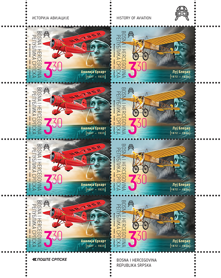 Amelija Erhart je bila američka pionirka avijacije i borac za prava žena. Nešto prije svog 40. rođendana, krenula je u avanturu koju niko do tada nije niti probao – krenula je na let oko svijeta. Međutim, nestala je iznad Pacifika 2. jula 1937. godine. Taj događaj smatra se jednom od najvećih zagonetki dvadesetog vijeka. Amelija je postala prva žena koja je preljetela Atlantik, prvo kao putnik 1928. godine, a četiri godine kasnije sama je letjela. U 1935. godini, Erhartova je postavila tri impresivna rekorda. Preletjela je samostalno od Honolulua na Havajima do Ouklenda u Кaliforniji. Tada je preletjela 3.860 km, za 18 sati i 16 minuta. Bila je prva osoba koja je to učinila sama. Zatim je letjela iz Los Anđelesa u Meksiko Siti, a za manje od mjesec dana , odletjela je iz Meksiko Sitija u Njuark (Nju Džerzi). Nijedan od tih letova nikada ranije nije bio samostalan, od strane muškarca ili žene. Željela je i da pokaže kako avijacija ne pripada samo muškarcima, kako su žene ravnopravne i mogu postići sve što i pripadnici jačeg pola. Amelija Erhart je bila žena neograničenog duha, borac za svoja i prava svih drugih žena, nezaustavljiva i preduzimljiva. Luj Blerio je bio francuski pilot i konstruktor aviona. Njagovi počeci u avijaciji nisu bili uspješni. Gradio je čitav niz letjelica, sa mašućim krilima, ali tek u periodu 1900 - 1903. uspijeva da napravi donekle uspješan model. Poslije tog perioda, uglavnom je gradio jednokrilne avione. Njagov tip iz 1906. ima motor sa tri cilindra. Blerio je najpoznatiji po prvom uspješnom prelijetanju Lamanš kanala 1909. godine između Кalea i Dovera. Pređena udaljenost je bila oko 40 kilometara, vrijeme leta 37 minuta, a visina leta između 50 i100 metara. U Prvom svjetskom ratu njegovi modeli su bili vrlo značajni u francuskom ratnom vazduhoplovstvu, a prodavani su i drugim državama. Do kraja života Blerio je značajno doprinio razvoju vazduhoplovstva i prvi je nosilac pilotske diplome Međunarodne vazduhoplovne federacije (FAI).