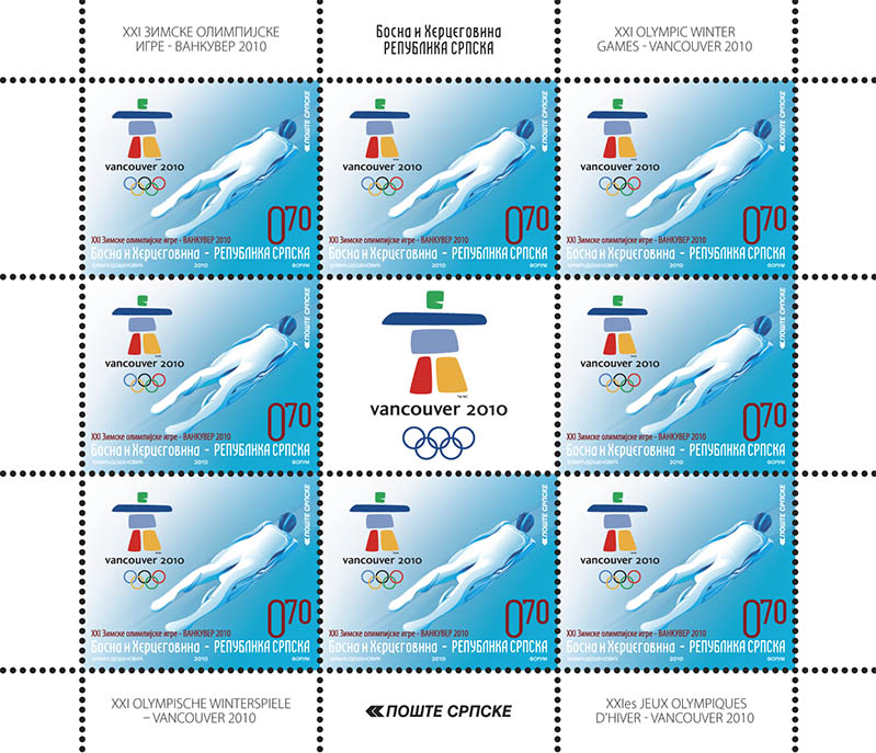 Naziv izdanja: XXI Zimske olimpijske igre-Vankuver 2010 Datum izdanja: 05.02.2010. Autori: mr Božidar Došenović i Nebojša Đumić Vrsta izdanja: prigodno Tehnika štampanja: višebojni ofset Šalterski tabak: 8+1 (3x3) Papir: muflep 100g Štamparija: Forum, Novi Sad