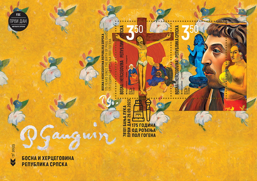 Ežen Anri Pol Gogen je jedan je od tri slikara postimpresionizma. On je imao svoj stil: slikao je pomoću velikih površina oivičenih crnom linijom (slično vitražu). Taj stil zvao se sintetizam i u njemu boja ne određuje predmet. Gogen je preteča fovizma. Godine 1886. Gogen je prvi put boravio u Pont-Avenu u Bretanji, gdje se upoznao sa Emilom Bernarom, osnivačem kloazonizma. Novembra iste godine je u Parizu sreo Van Goga. Naredne godine boravi u Panami, zatim na Martiniku, gdje ga za slikanje inspirišu boje i sunce tropskih pejzaža. Najzad obolijeva od malarije i vraća se u Pariz, pa početkom 1888. ponovo u Pont-Aven gde se priključuje slikarskoj školi mlađih kolega. Tu u jednom pismu opisuje svoju ideju o umjetnosti: Savjet je, ne kopirajte mnogo prirodu, umjetnost je apstrakcija, izvucite je iz prirode i sanjajte pred njom, razmišljajte više o stvaranju nego o rezultatu. Jedini način da se uzdignemo do Boga, je da činimo ono što i naš božanski gospodar, da stvaramo. Na Tahitiju je proveo drugi dio svog života i tamo se potpuno posvetio slikanju. Njagova djela su „Devojke sa Tahitija nose cvijeće“, „Odakle dolazimo, ko smo, kuda idemo“. Na Tahiti odlazi prvi put 1891, a 1895. definitivno odlazi u Francusku Polineziju, gdje je umro u patnjama i gorčini. Njagove polinezijske teme svode se na prikazivanje animalne ljepote ženskog tijela u šaroliko ornamentiranim tkanjima u gustom zelenilu tropske vegetacije. Svoje doživljaje i ispovijesti objavio je u knjigama „Noa Noa“ i „Prije i poslije“. Gogenova umjetnost je postala popularna nakon njegove smrti, posebno zahvaljujući naporima trgovca umjetničkim djelima Ambroaza Volara, koji je organizovao izložbe njegovih radova tokom poznog dijela njegove karijere, i pomagao u organizovanju dvije posthumne izložbe u Parizu. Autor: Nebojša Đumić Izdavač: Pošte Srpske a.d. Banjaluka