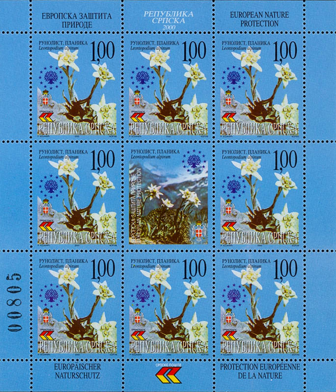 Naziv izdanja: Evropska zaštita prirode Datum izdanja: 31.10.2000. Autor: Radomir Bojanić Vrsta izdanja: prigodno Tehnika štampanja: višebojni ofset Šalterski tabak: 8+1 (3x3) Papir: kredast Štamparija: FORUM - Novi Sad