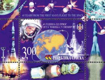 Motiv: Portret Jurija Gagarina, lansiranje, putanja i spuštanje "Vastoka 1" Kataloški broj: SP 198 (BL 005) Zupčanje: 13 3/4 Nominalna vrijednost: 3,00 KM Tiraž: 10.000
