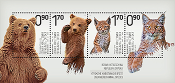 Biodiverzitet na Zemlji danas čine milioni različitih bioloških vrsta, koje su proizvod 4 milijarde godina evolucije. Iako je izumiranje životinja dio prirodnog ciklusa, prisustvo i dominacija ljudi na Zemlji ubrzala je stopu po kojoj vrste nestaju. Broj ugroženih vrsta širom svijeta raste. Prema podacima Međunarodne unije za zaštitu prirode (IUCN) Bosna i Hercegovina ima 55 ugroženih vrsta.Vlada Republike Srpske je 2012. godine donijela Uredbu o Crvenoj listi zaštićenih vrsta flore i faune. Jedna od vrsta koja se nalazi na Crvenoj listi i spada u ugrožene vrste u našoj zemlji je ris. Ris (Lynx lynx) je zvijer iz porodice mačaka koji je prepoznatljiv po dlakavim kićankama crne boje, koji se nalaze na vrhovima ušiju. Glavni plijen su mu srne, divokoze i puhovi, a glavni prirodni neprijatelji vuk i medvjed. Osim prirodnih neprijatelja najveća opasnost za risa je čovjek koji se bavi krivolovom i lovi ga zbog krzna i trofeja. Ris je proglašen trajno zaštićenom vrstom u Bosni i Hercegovini jer je početkom 20. vijeka već jednom bio istrebljen. U Bosni i Hercegovini ris se ponovo pojavio nakon reintrodukcije u Sloveniji i prema trenutnim podacima brojnost populacije iznosi oko 60 jedinki. Mrki medvjed (Ursus artcos) spada u najveću divlju životinju u BiH. Dužina njegovog tijela može biti do 2,8 m, a masa do 300 kg. Uglavnom je biljojed ali meso jede kad god mu je dostupno.U toku zime zbog nestašice hrane prelazi u stanje mirovanja i vrijeme provodi u brlogu. Zbog promjene uslova u njihovim prirodnim staništima, medvjedi se spuštaju u niže dijelove u potrazi za hranom i privučeni deponijama dolaze do ljudskih naselja i pričinjavaju štete što dovodi do straha među stanovništvom. Da bismo ovo spriječili treba da obezbjedimo hranilišta za medvjede u njihovim staništima, koja će ih tu i zadržati. Broj medvjeda u Republici Srpskoj iznosi oko 700 jedinki. Autor: Nebojša Đumić Saradnja: Tatjana Borenović Izdavač: Pošte Srpske, a.d. Banjaluka