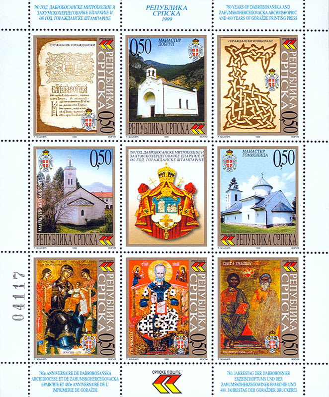 Naziv izdanja: 780 godina Dabrobosanske mitropolije i Zahumskohercegovačke eparhije i 480 godina Goraždanske štamparije Datum izdanja: 26.05.1999 godine Autor: Radomir Bojanić Vrsta izdanja: prigodno Tehnika štampanja: višebojni ofset Šalterski tabak: 8+1 komad (3x3) Papir: kredast Štamparija: FORUM - Novi Sad
