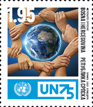 Stvorene prije 75 godina u pepelu Drugog svjetskog rata, Ujedinjene nacije danas ostaju vjerne svojoj osnivačkoj misiji: okupljanju nacija i naroda radi očuvanja mira i sigurnosti i poboljšanju života svuda. Jednakost i dostojanstvo svih ljudi i dalje su vodeća načela, sadržana u Povelji Ujedinjenih nacija, potpisanoj u San Francisku 26. juna 1945. Na ovu istorijsku godišnjicu, razmislimo o svemu onome što je čovječanstvo zajedno postiglo, i o svemu tome što još ostaje da se uradi. I vratimo se viziji Povelje Ujedinjenih nacija - ona je danas relevantnija nego ikad ranije. Ovo će biti divna prilika za razmišljanje o istoriji Ujedinjenih nacija i sagledavanje trajnih dostignuća Organizacije. To će takođe biti prilika da se ukaže na to gde UN i međunarodna zajednica u cjelini mogu usredsrediti svoje napore na suočavanje sa trenutnim i budućim izazovima kroz tri stuba našeg rada: mir i bezbjednost, razvoj i ljudska prava. Ujedinjene nacije pozivaju sve poštanske uprave širom svijeta da zajedno sa poštanskom upravom Ujedinjenih nacija (UNPA) izdaju marke 75. godišnjice Ujedinjenih nacija 2020. godine u znak sjećanja na ovu posebnu priliku. Pošte Srpske su se rado odazvale pozivu i odlučile da učestvuju u ovom velikom događaju i da izdaju prigodnu poštansku marku. Autor: Nebojša Đumić Izdavač: Pošte Srpske a.d. Banja Luka Saradnja: Poštanska administracija Ujedinjenih nacija Štamparija: Blicdruk, Sarajevo