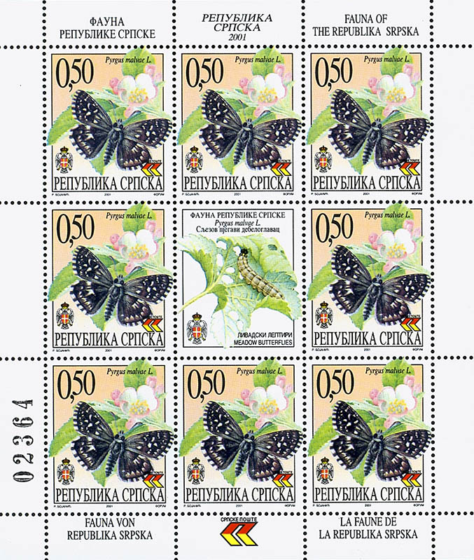 Naziv izdanja: Fauna Republike Srpske - Livadski leptiri Datum izdanja: 19.06.2001 Autor: Radomir Bojanić Vrsta izdanja: prigodno Tehnika štampanja: višebojni ofset Šalterski tabak: 8+1 komad (3x3) Papir: kredast Štamparija: FORUM - Novi Sad