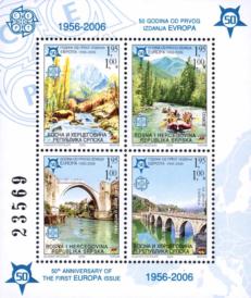 Motiv: Prašuma Perućica, odmori - rafting, Stari most u Mostaru i na Drini ćuprija Kataloški broj: SP 342 (BL 014) Zupčanje: 13 3/4 Nominalna vrijednost: 4x1,95 KM (4x1,00 EUR) Tiraž: 30 000