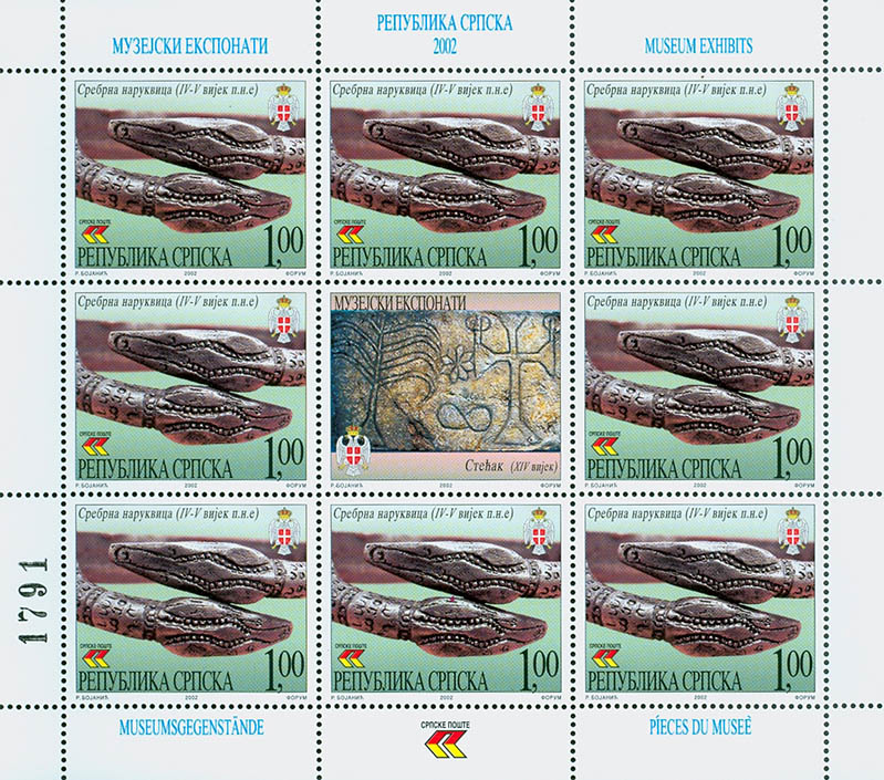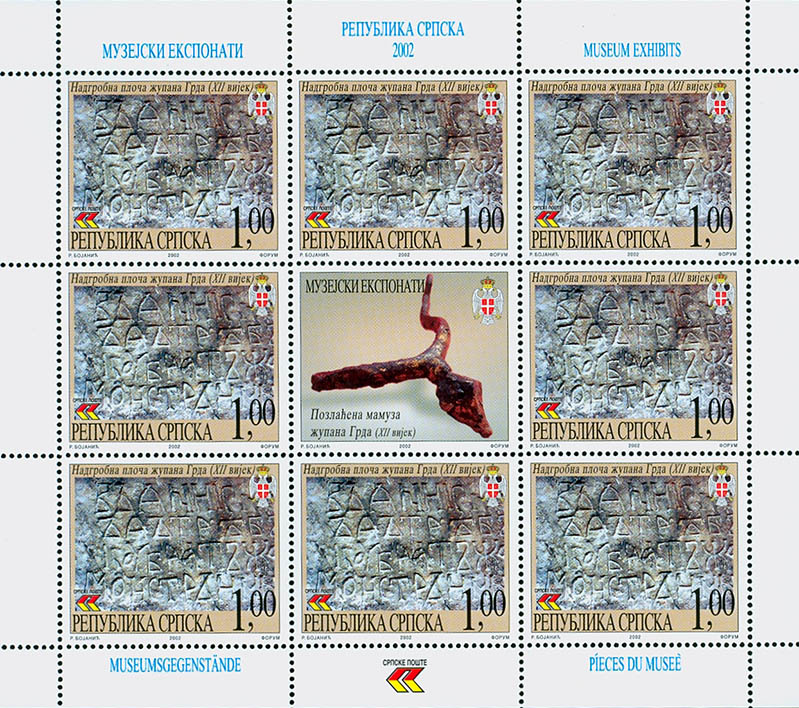 Motiv: Nadgrobna ploča Župana Grda (XII vijek) Kataloški broj: SP 253 Zupčanje: 13 3/4 Nominalna vrijednost: 1,00 KM Tiraž: 20.000