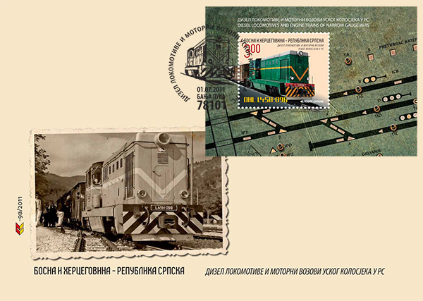 Naziv izdanja: Dizel lokomotive i motorni vozovi uskog kolosjeka u RS Datum izdanja: 01.07.2011. Autori: mr Božidar Došenović i Nebojša Đumić Vrsta izdanja: prigodno Tehnika štampanja: višebojni ofset Šalterski tabak: 8+1 i blok Papir: muflep 100g Štamparija: Forum, Novi Sad