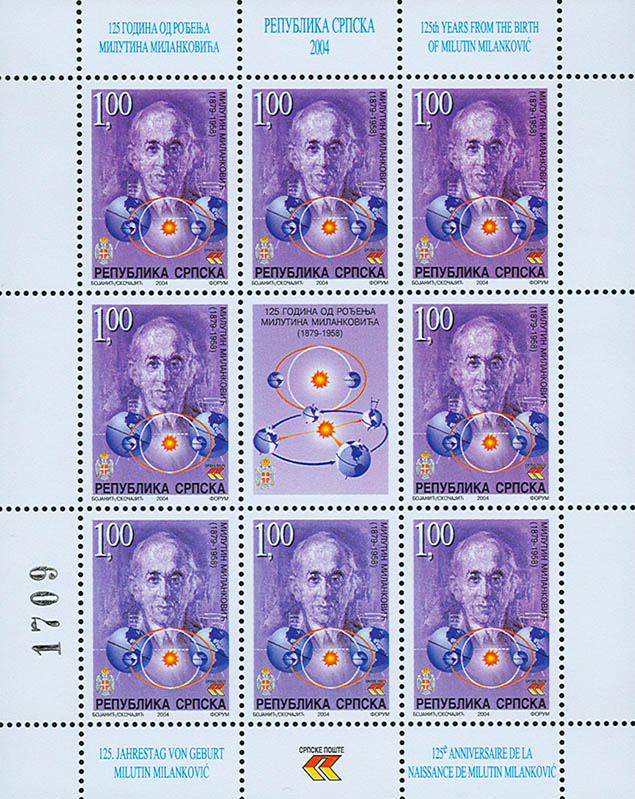 Naziv izdanja: 125 godina od rođenja Milutina Milankovića Datum izdanja: 28.05.2004. Autor: Bojanić/Skočajić Vrsta izdanja: prigodno Tehnika štampanja: višebojni ofset Šalterski tabak: 8+1 komad (3x3) Papir: kredast Štamparija: FORUM - Novi Sad