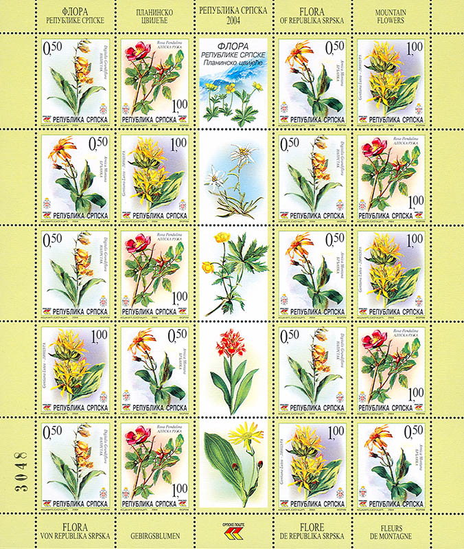 Naziv izdanja: Flora RS - Planinsko cvijeće Datum izdanja: 18.11.2004. Autor: Bojanić/Skočajić Vrsta izdanja: prigodno Tehnika štampanja: višebojni ofset Šalterski tabak: 20+5 komada (5x5) Papir: muflep, 90 gr Štamparija: FORUM - Novi Sad