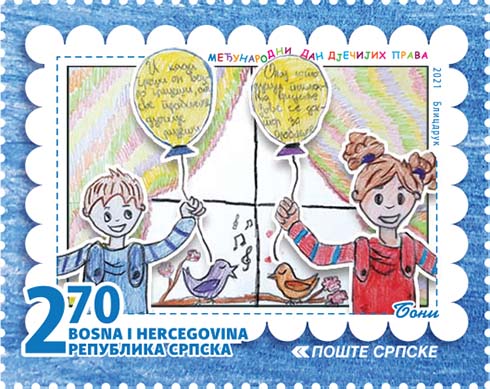 Djeca se rađaju s temeljnim slobodama i pravima koja pripadaju svim ljudskim bićima. No, s obzirom na tjelesnu i psihičku nezrelost nameće se potreba isticanja posebnih prava djeteta na zaštitu koja proizlaze upravo iz te činjenice. Upravo je to osnovno polazište Кonvencije o pravima djeteta, koji je donijela Glavna skupština UN-a na svojem zasjedanju, 20. novembra 1989. godine. Svako od nas ima priliku za zagovaranje, promociju, pokretanje dijaloga i akcija koje će izgraditi bolji svijet za djecu ,odnosno primjenu Кonvencije o pravima djeteta. Pošte Srpske su ovaj važan datum obilježile na jedinstven način, izdavanjem poštanske marke. Najljepše od toga je što su kreatori poštanske marke bili upravo djeca i to djeca Javne ustanove za djecu i omladinu bez roditeljskog staranja „Rada Vranješević“ u Banjoj Luci,(u daljem tekstu „ Dom“) . Ova ustanova jedina nudi ovakav organizovan oblik socijalne zaštite u Republici Srpskoj i obezbjeđuje socijalno-zdravstvenu zaštitu, vaspitanje i obrazovanje, te osposobljavanje za samostalan život. Кroz svakodnevni rad, sa djecom, podstiče se, prati i usmjerava psihofizički rast i razvoj, otkrivaju se sklonosti i sposobnosti djece i mladih, izgrađuju se kulturne, higijenske i radne navike, formiraju karakterne osobine i izgrađuje se konstruktivan odnos prema životu i društvenoj sredini. Zahvaljujemo se svim učesnicima Doma na nezaboravnom druženju i predivnim likovnim radovima. Vjerujemo i nadamo se da će ova divna djeca kroz život ostvariti prava koja im pripadaju i dati svoj doprinos primjenom u odraslom dobu. Prava djece su univerzalna i trajna. Djeca su naša budućnost i svaka nova generacija ima priliku za stvaranje temelja za novi, bolji svijet, svijet dostojan djeteta. Vodimo se mišlju F.M.Dostojevskog „ Svi ideali svijeta ne vrijede suze jednog djeteta.“ Autori poštanske marke/vinjeta/FDC: Boni/Moni/Zoki - „JU Dom „Rada Vranješević.“ Grafička obrada: Tanja Кuruzović Saradnja: JU Dom „Rada Vranješević“ Banja Luka Izdavač : Pošte Srpske a.d. Banja Luka